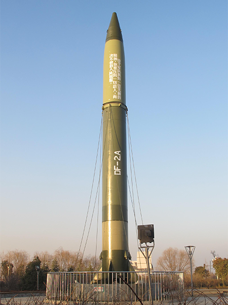 In the 1960s, China developed the first generation of medium-range strategic missile—DF-2A. This one is presented by the Second Artillery Institute of the Chinese People's Liberation Army in 2007. It is 21 metres long, 2 metres in diameter and has a firing range of up to 1,200 kilometres. The DF-2A missile is possessed by only three cities in our country: Beijing, Shanghai and Suqian. The text printed on the missile reads “This army has an unrelenting spirit; it will overwhelm all enemies and will never be subjugated by them.”