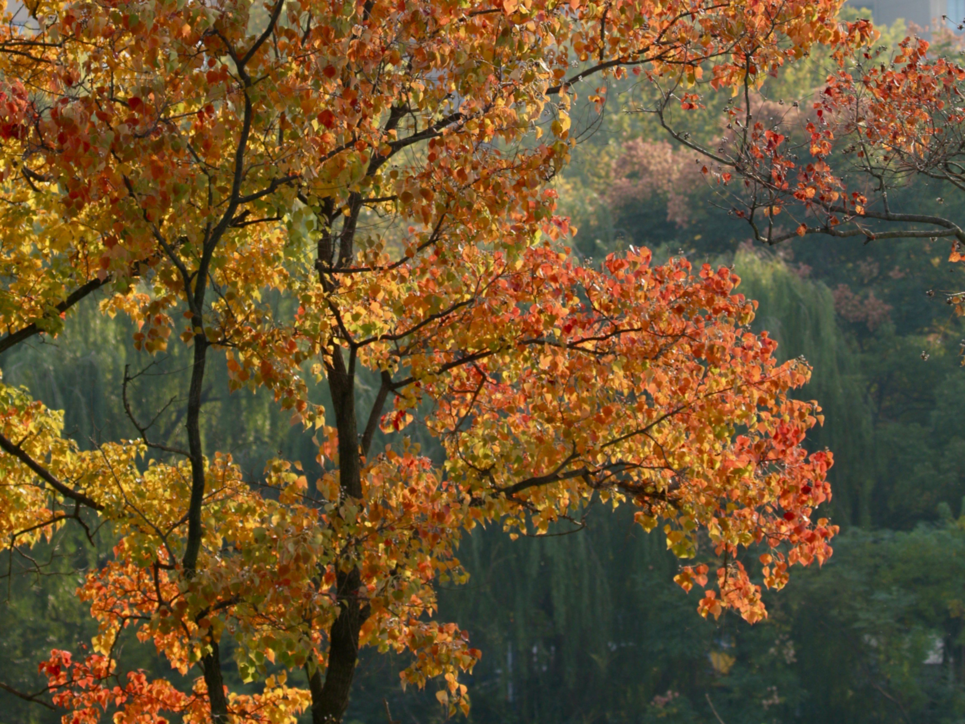 秋季叶色:从绿到红的“渐变艺术”。乌桕的秋叶是秋季最富层次的色彩之一。中秋整树叶片进入“五彩模式”——黄色、橙黄、橙红、猩红甚至紫红色交织,宛如画家打翻了调色盘;深秋叶片逐渐脱落,落地后仍能保持鲜艳色彩,为地面铺就“彩色地毯”。
