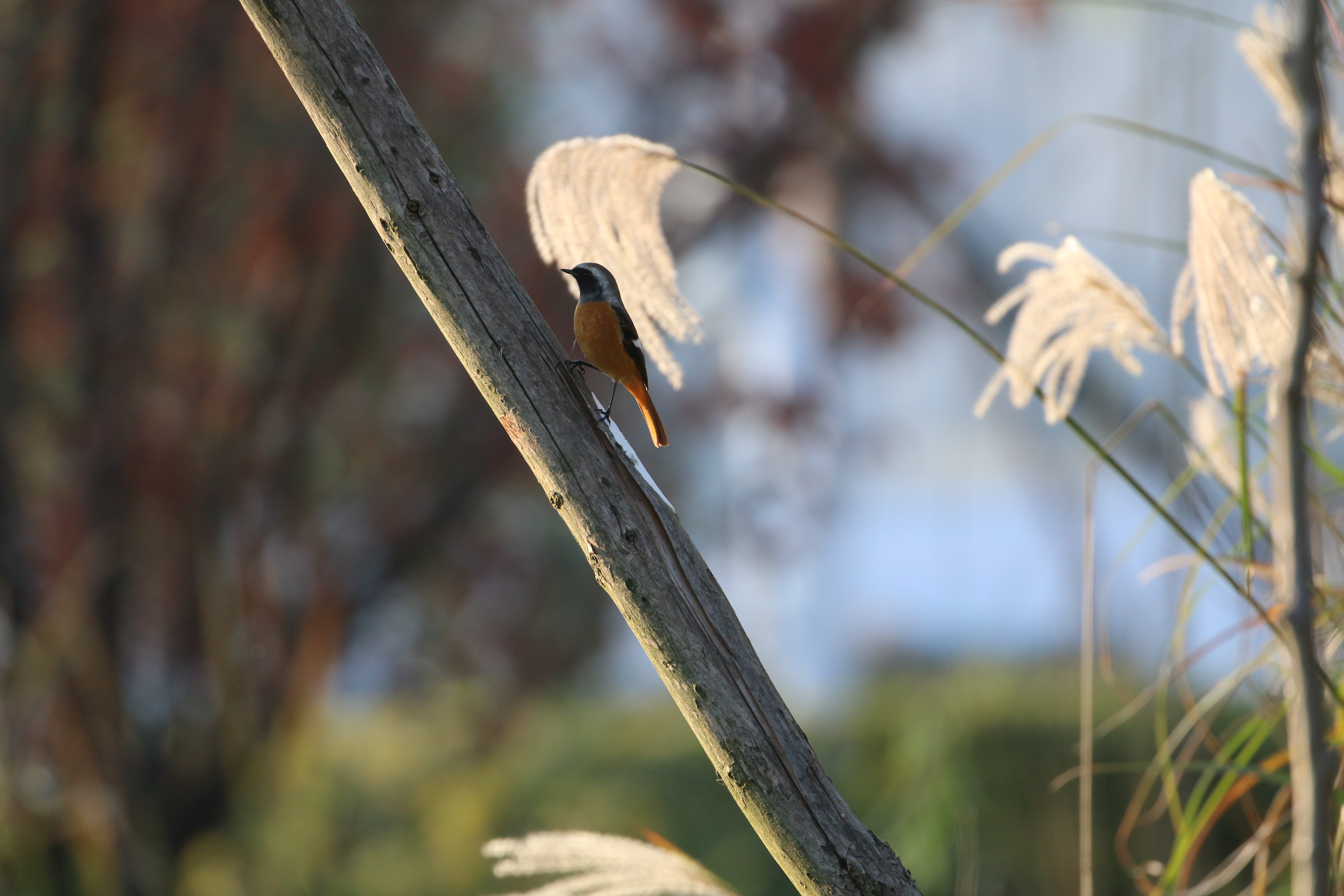 北红尾鸲是公园的“颜值担当”,体型比白腰文鸟稍大(约15厘米)。雄鸟和雌鸟的“穿搭”截然不同,雄鸟像一团跳跃的火焰,背部和头部是深灰黑色,腹部和尾巴是鲜艳的橙红色,尾巴展开时像一把燃烧的扇子,阳光下格外耀眼;