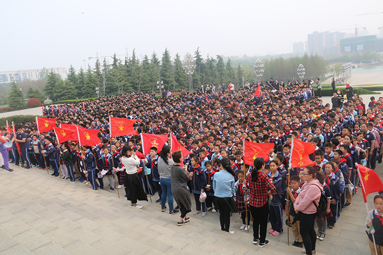 宿迁市钟吾初中、宿迁市实验学校、宿迁市苏州外国语学校、宿迁学院及宿迁学院附属学校、宿豫张家港实验小学及各幼儿园等大中小学师生高举队旗,排着整齐的队伍来到彭雪枫纪念馆瞻仰彭雪枫将军。